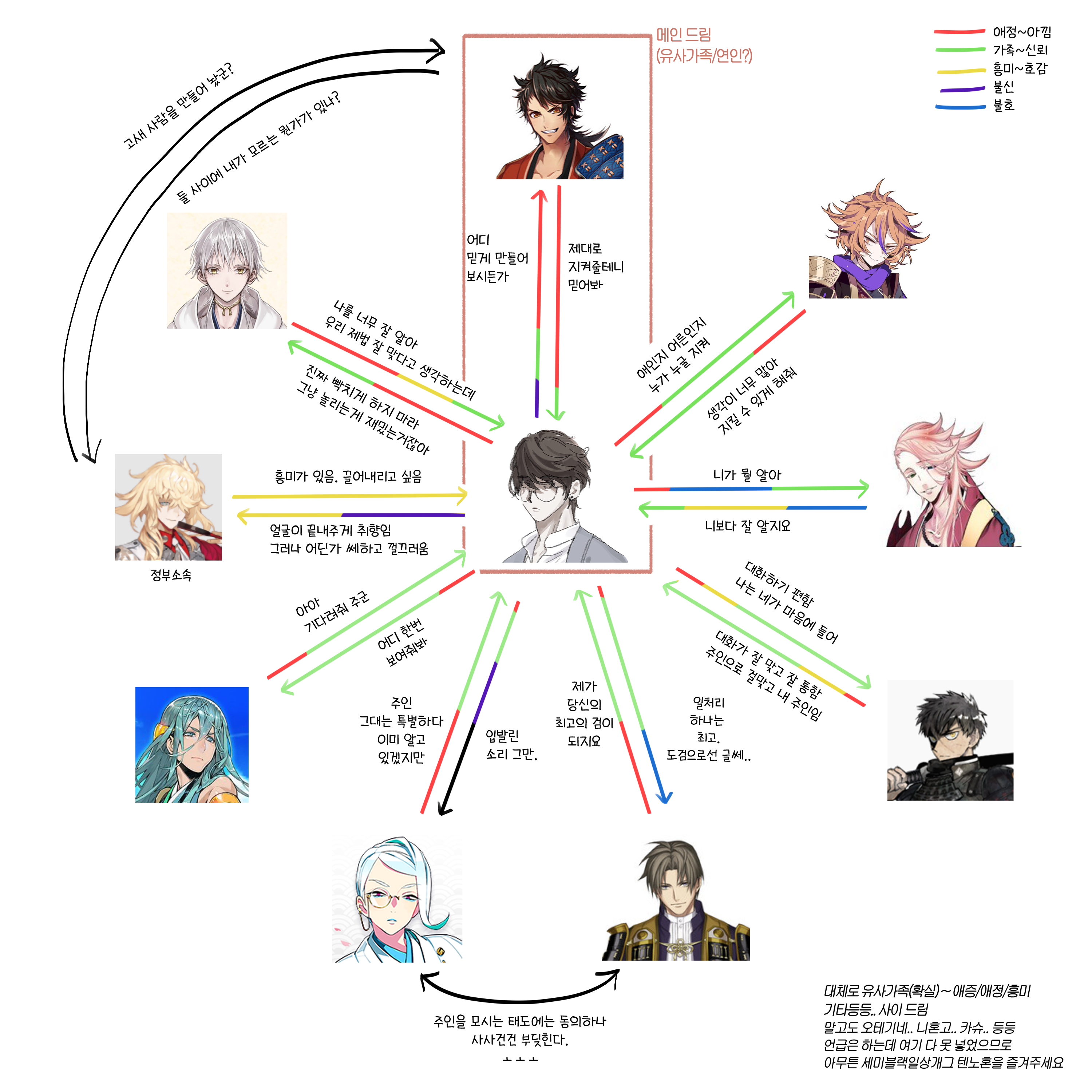 초기도, 유사 가족과 비슷한 애정. 수많은 도검남사들 사이에 연인에 가장 가까운 형태. 제일 믿고 신뢰하는 복잡미묘한 사이의 남사.