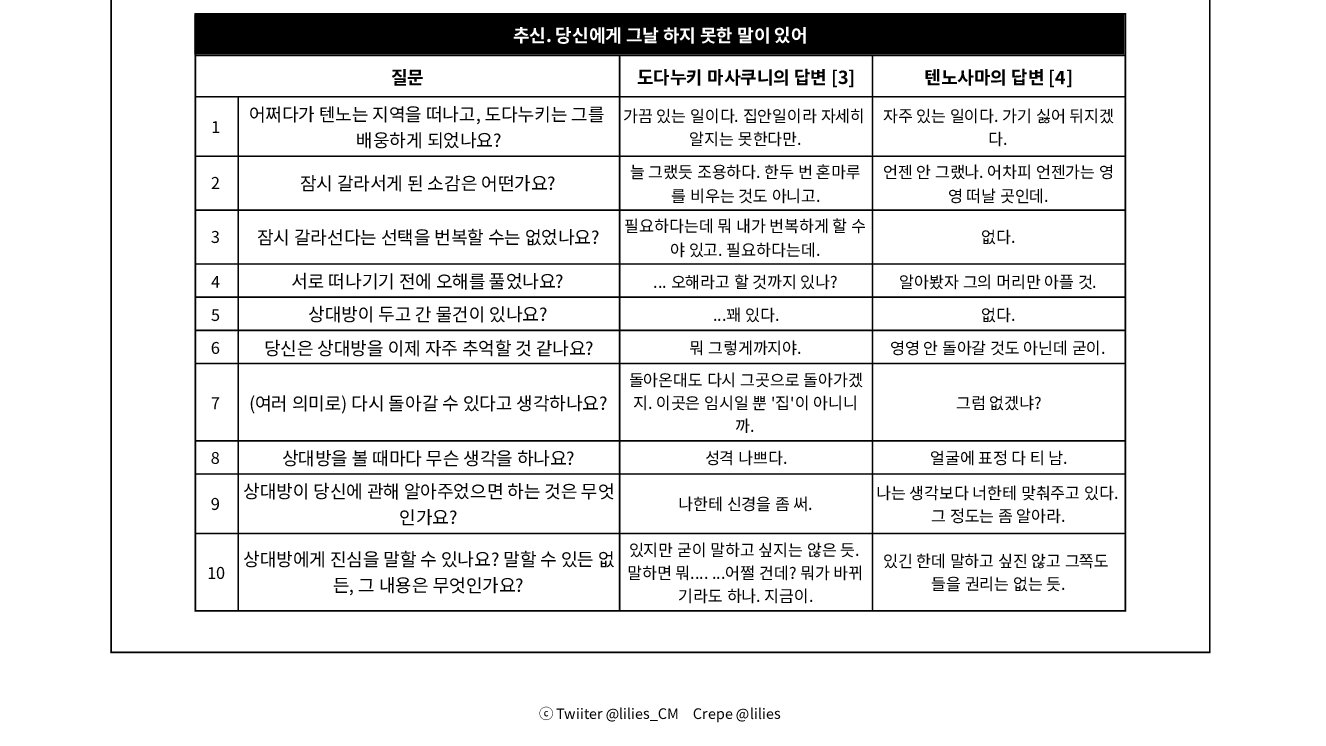 - 직접적으로 사랑한다고 말하는 관계는 아닙니다. 실제로도 꽤 건조하고 버석한 관계이며 많은 대화가 오가는 사이도 아닙니다. 공식적으로 '사랑한다는 한 마디를 하지 않아서 사후에 아무것도 남지 않은 관계' 입니다. 이미 nn년 같이 산 노부부 st. 그것과 별개로 스킨십은 꽤 자주 합니다...