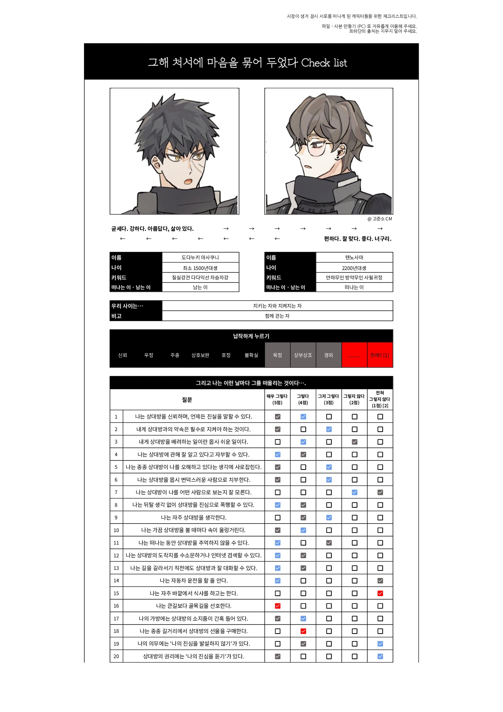 서로의 과거나 불확실한 미래보다 현재에 집중하는 타입. 그래서 (현재진행형으로) 몰랐던 상대의 일면에 대한 반응이 긍정적으로도 부정적으로도 큰 편입니다.